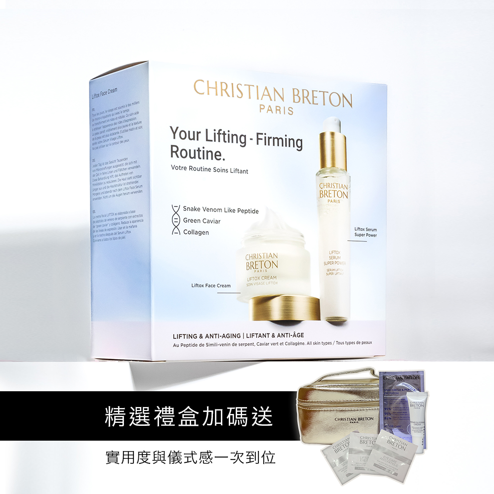 禮盒內含: ⟝LIFTOX鉑金級緊實面霜50ml ⟝LIFTOX鉑金級緊實精華液30ml